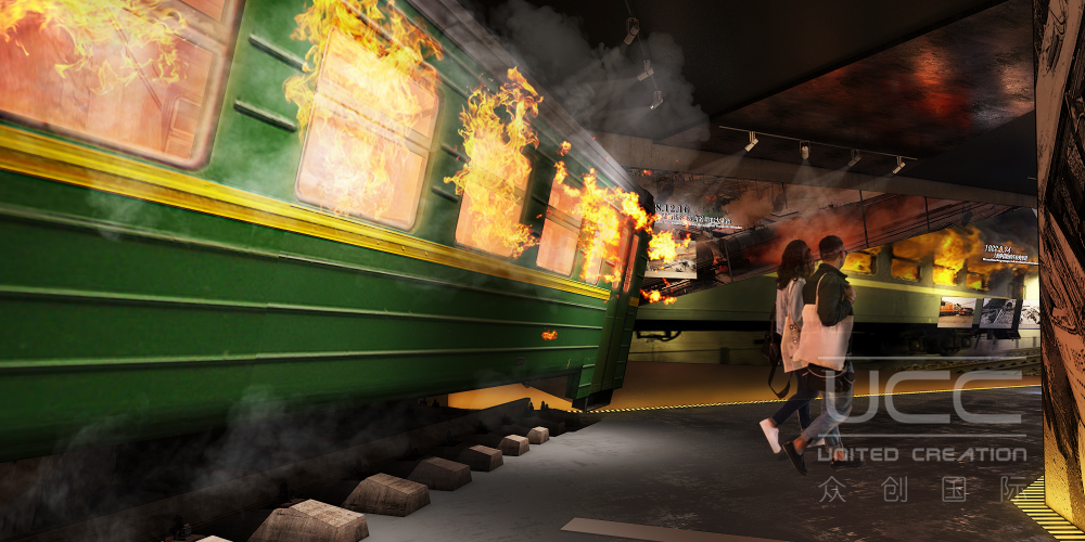 2.背墻手繪畫面,3.投影區(qū)域為需手繪老電影畫面圖案與投影畫面虛化融合,360°沉浸式場景體驗,還原火災現(xiàn)場真實感,失火地鐵列車,